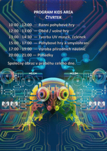 KIDS AREA je otevřena celý den od čtvrtka do neděle, program je plánován v časech 9 až 21 hodin (neděle jen dopoledne).